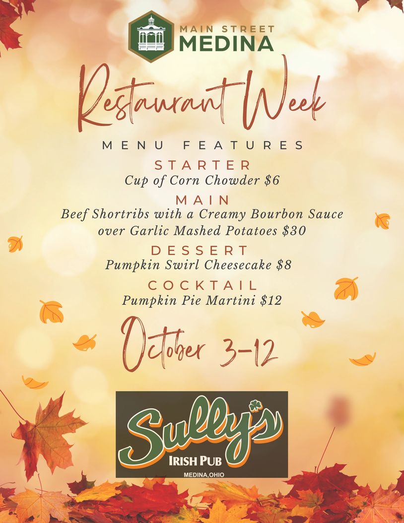 Join us for Main Street Medina's Restaurant Week featuring Fall flavors! This menu will be exclusively available October 3-12.