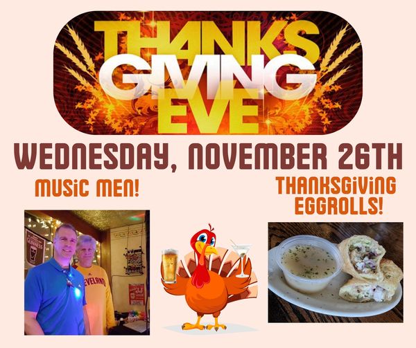 Join us for Thanksgiving Eve on Wednesday, November 26th! We will be featuring our famous Thanksgiving Eggrolls! The Music Men will be filling your night with music and humor starting at 8pm. You have to spend Thanksgiving with your family, so at least enjoy a night out beforehand!